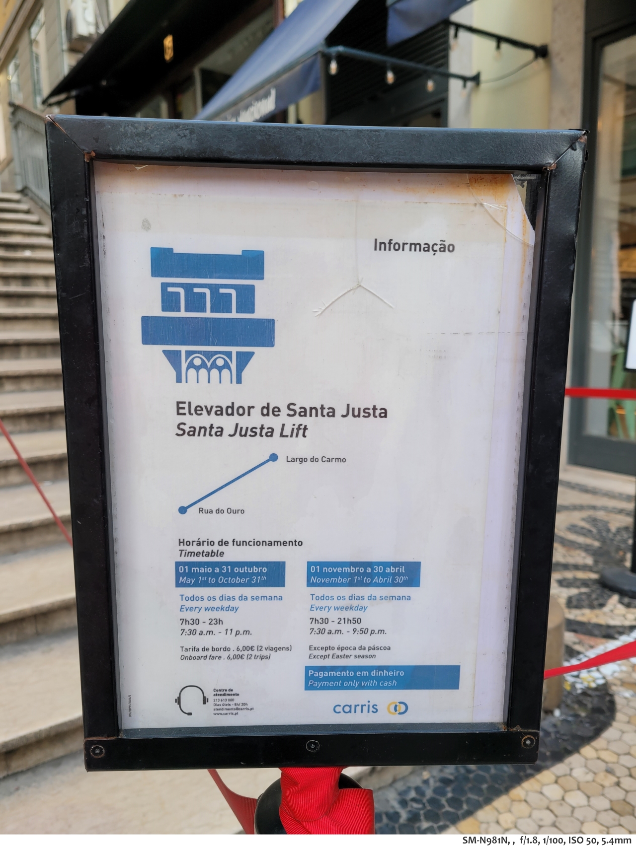 사진을 찍고 있는데 운영하시는 분처럼 보이는 분이 줄을 유도하는 바리게이트를 치셨다. 바리게이트를 고정하는 봉에 산타 후스타 엘리베이터의 운영시간이 적혀 있었다.